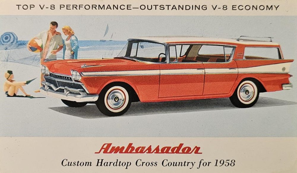 In 1958, Rambler’s postcard campaign captured the year’s fresh styling and broad model range with vivid illustrations and crisp, persuasive copy. The lineup featured everything from the budget-conscious Super 4-Door Cross Country wagon to the upscale Ambassador Custom Hardtop.