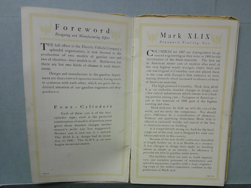 This is an original 1907 Columbia sales catalog. It features promotional highlights for the Columbia Motor Cars with illustrations and specifications.