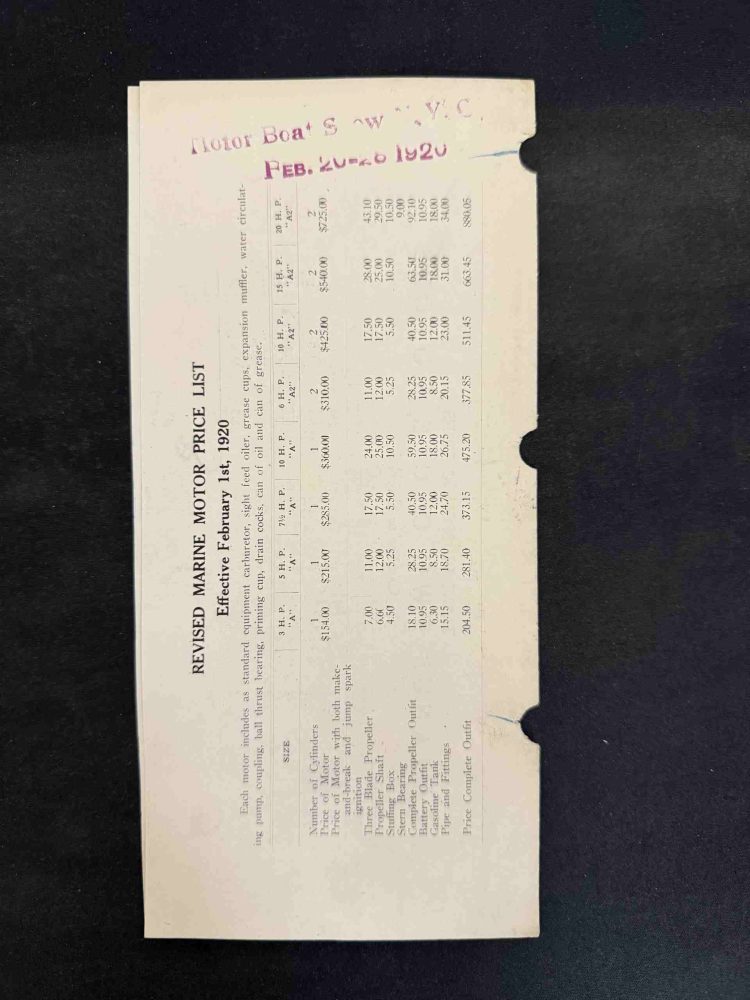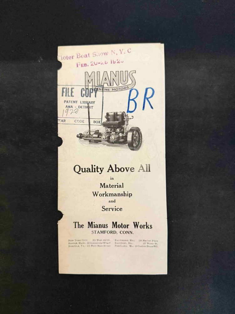 This is an original 1920 Mianus Marine Motor Sales Folder. It features specifications for the Mianus marine engines offered in the early 20th century.