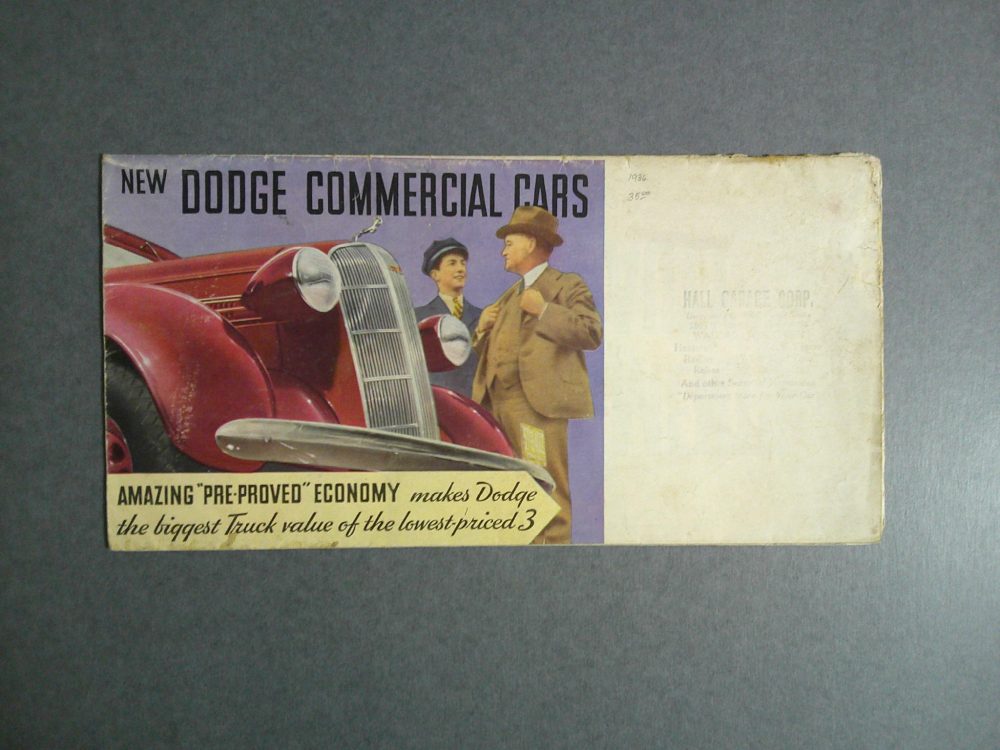 This is an original 1936 Dodge Commercial Cars sales folder. It features detailed promotional highlights for Dodge’s line of commercial vehicles for the 1936 model year.