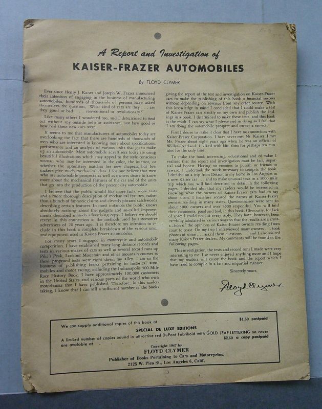 This is an original Kaiser-Frazer article. It features a report and investigation of Kaiser-Frazer automobiles by Floyd Clymer
