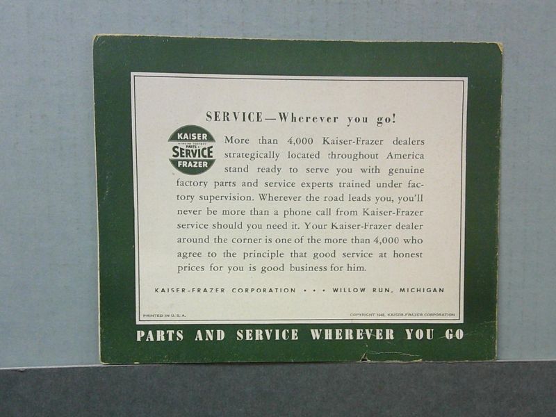 • Features Kaiser-Frazer models including Deluxe, Special and Frazer