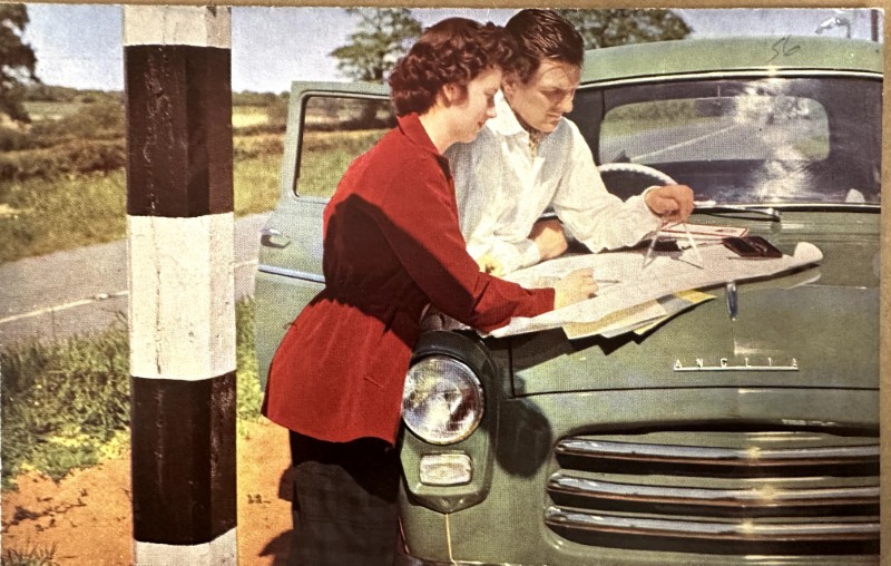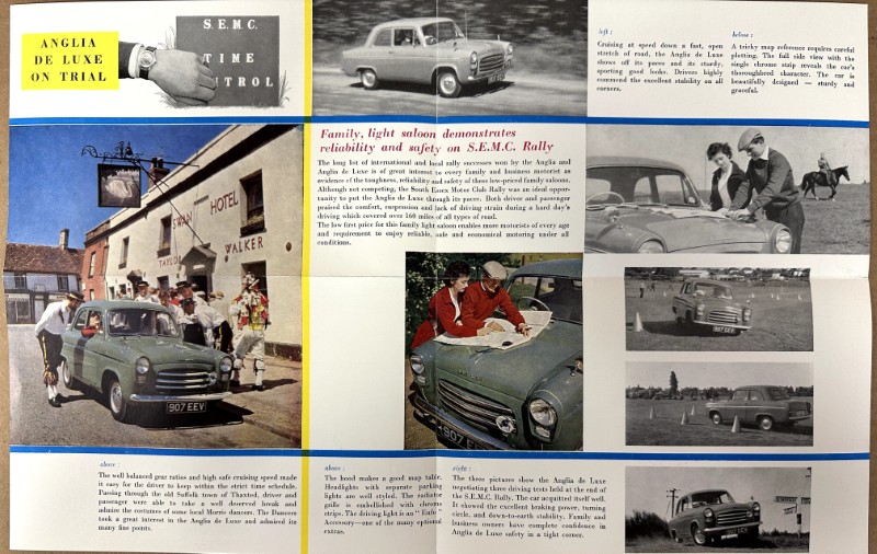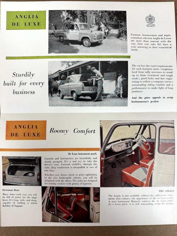This is an original Ford sales literature piece. It features a promotional highlight for the Ford Anglia with full colored photos.