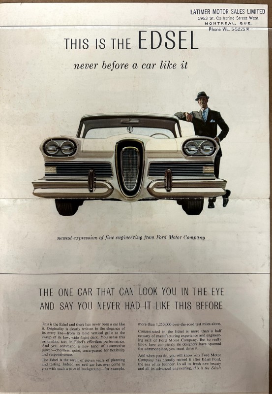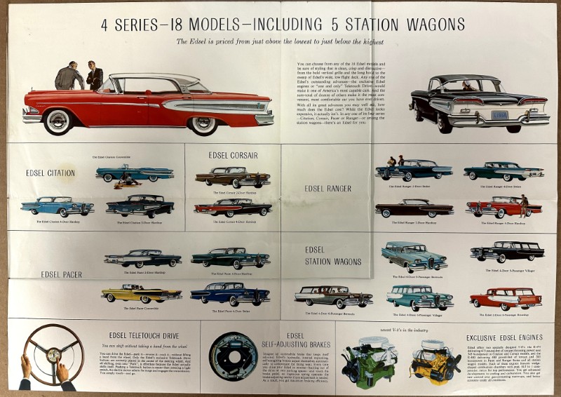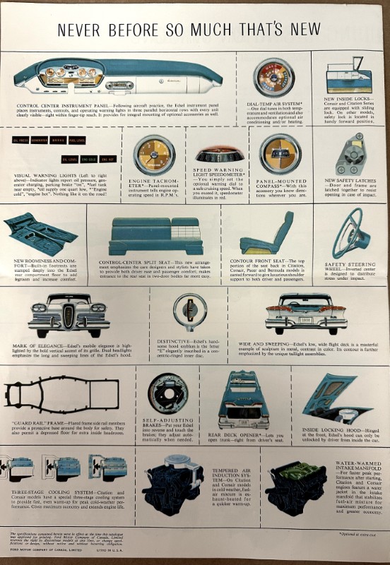 This is an original Ford sales literature piece. It features a promotional highlight for the Ford Edsel with colored photos.