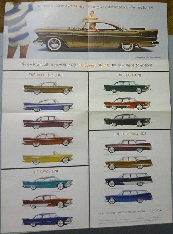 This is an original Plymouth sales folder. It features promotional highlights for the Plymouth lineup with illustrations and specifications.