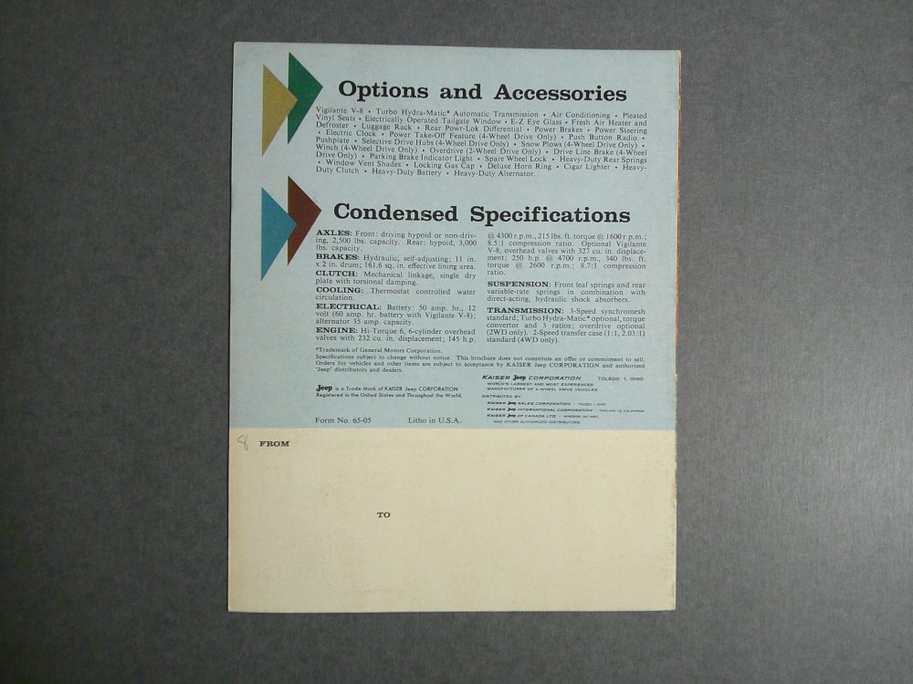 This is an original 1965 Jeep Wagoneer sales folder. It features promotional highlights and key features for Jeep’s early luxury 4×4 wagon.