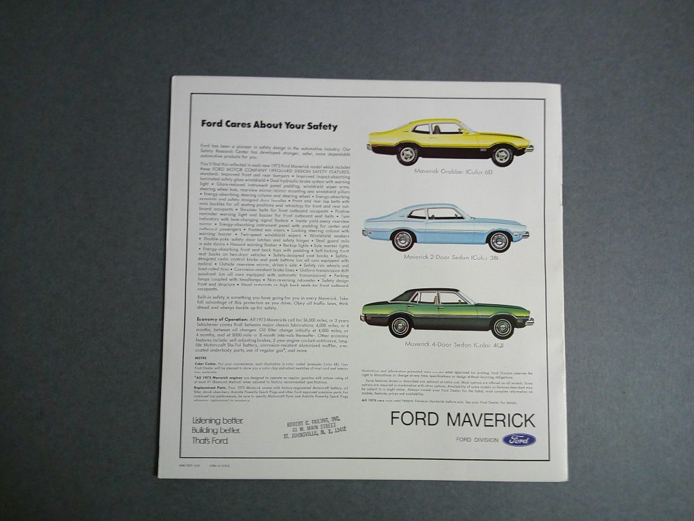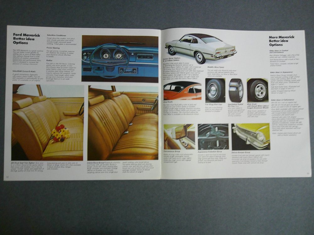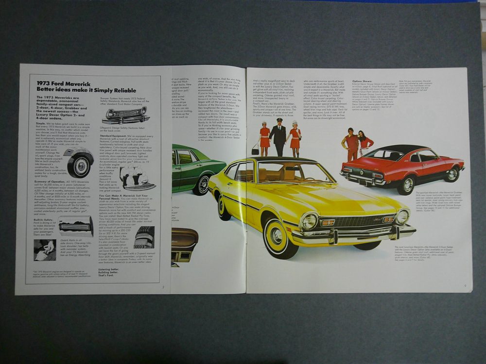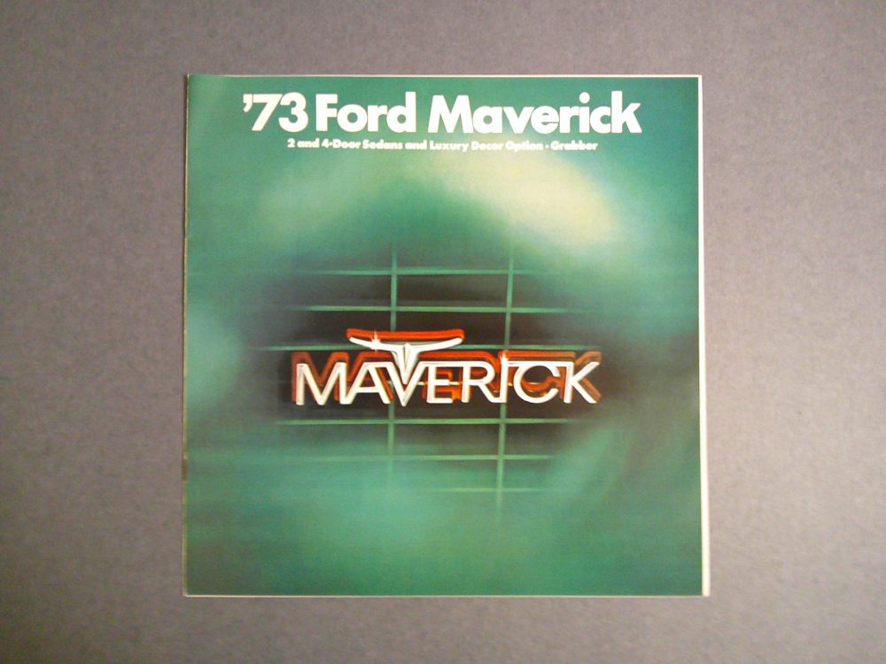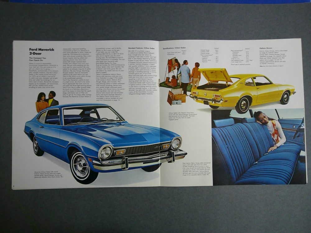 This is an original 1973 Ford Maverick sales catalog. It features information on available options for the 1973 Maverick lineup.