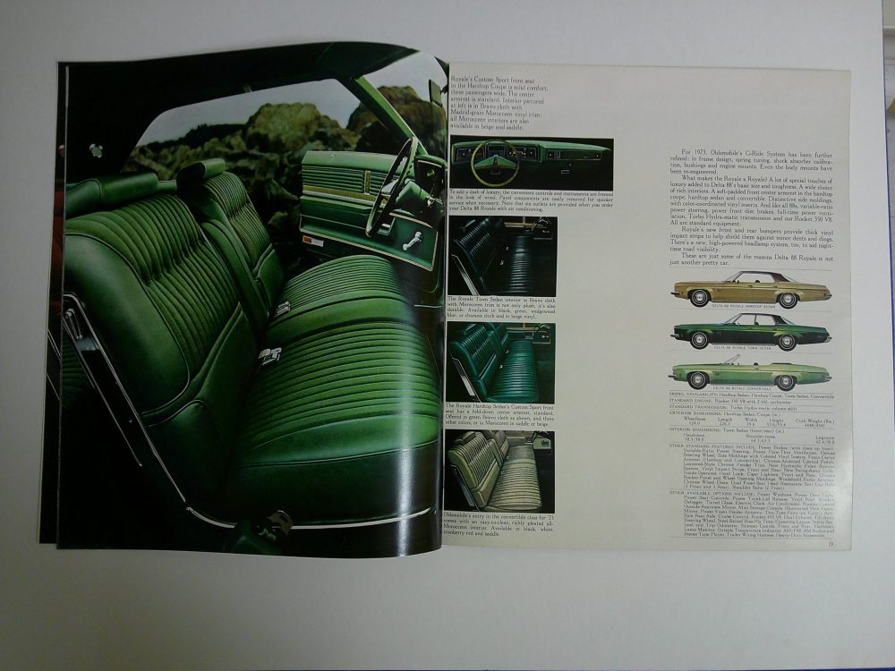 This is an original 1973 Oldsmobile sales brochure. It includes detailed information on models, features, specifications, and available options.