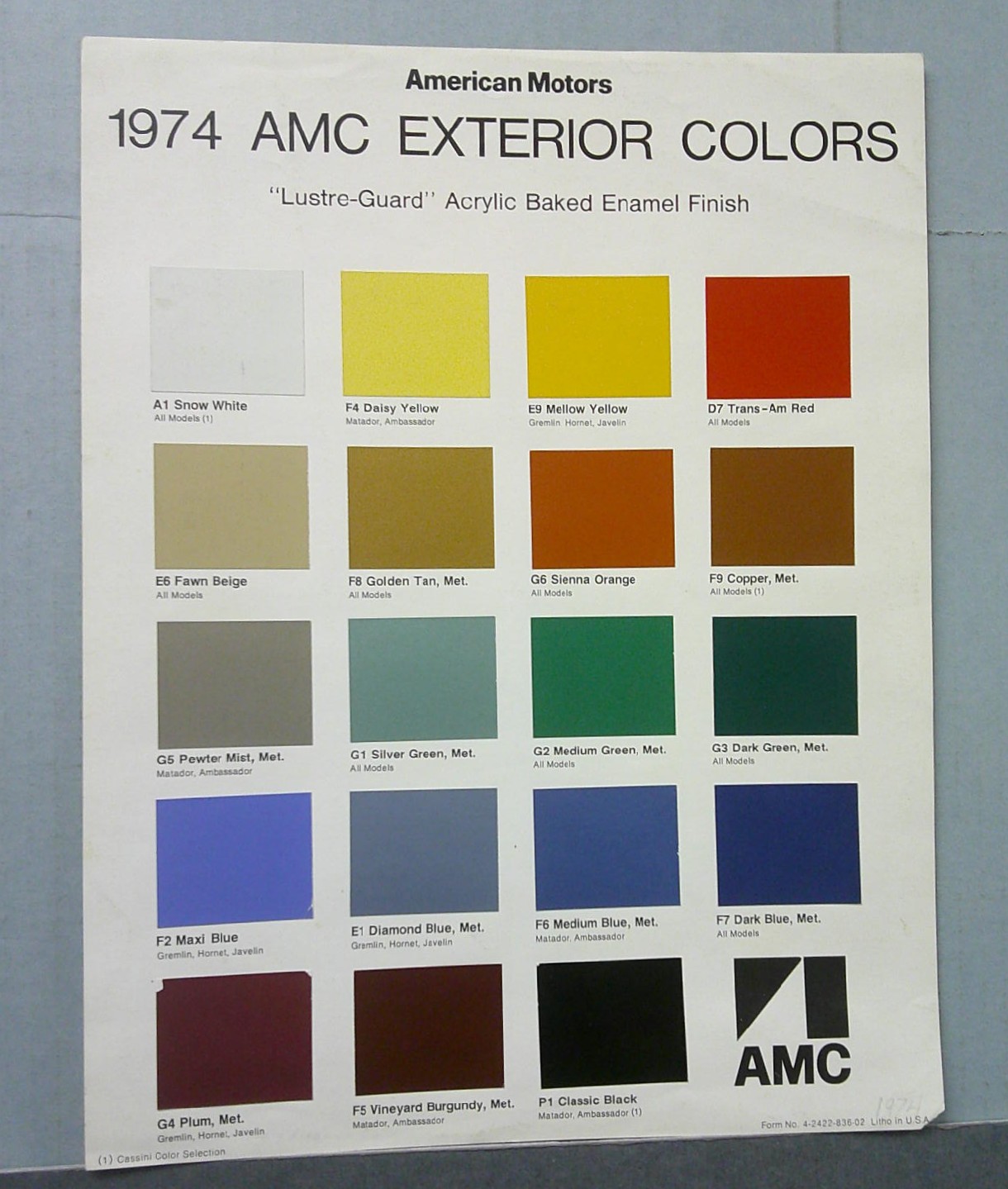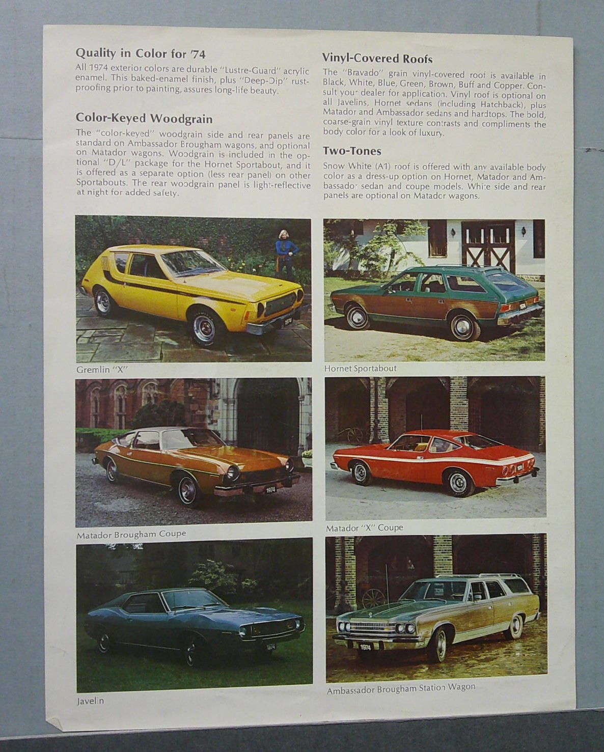 This is an original AMC sales sheet. It features exterior color for the 1974 AMC lineup.