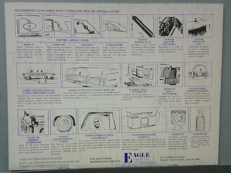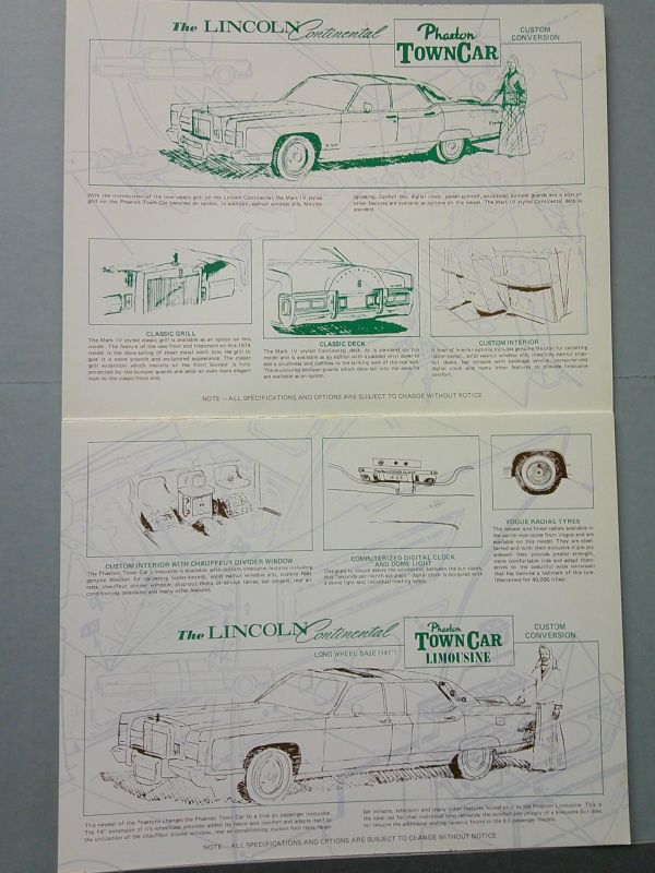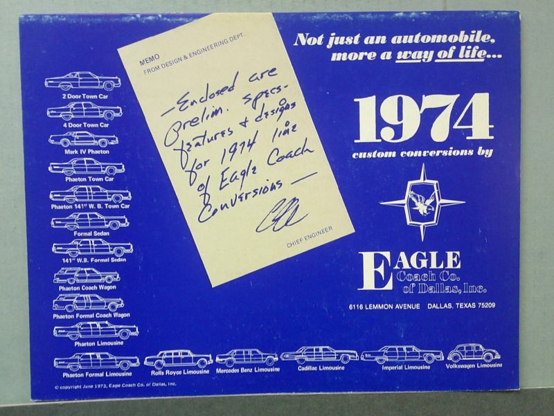 • Covers 1974 models including Town Car, Mark IV, Sedan, Phaeton Coach Wagon, Phaeton Limousine, Rolls Royce Limousine, Mercedes Benz Limousine, Cadillac Limousine, Imperial Limousine and Volkswagen Limousine