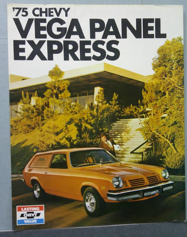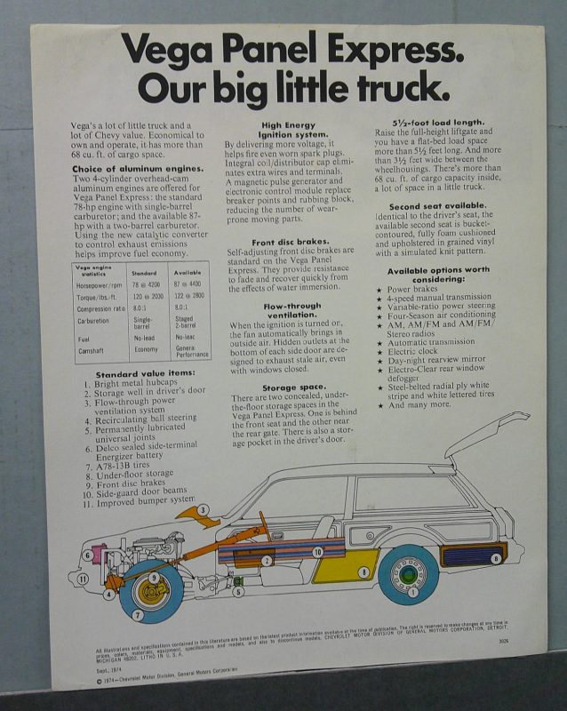 This is an original Chevrolet sales sheet. It features promotional highlights for the Chevrolet Vega Panel Express with full color photographs and specifications.