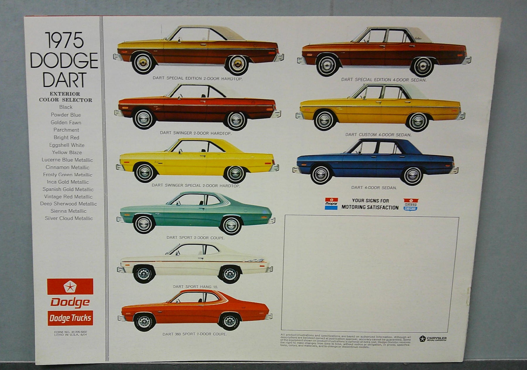 This is an original 1975 Dodge sales catalog. It highlights information on features and available options for Dodge’s Dart lineup.