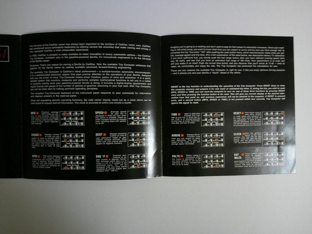 This is an original 1978 Cadillac Seville sales folder. It highlights features and specifications of the Trip Computer on the 1978 Seville.