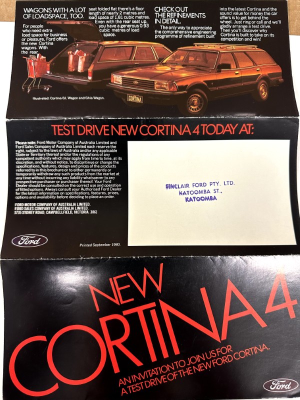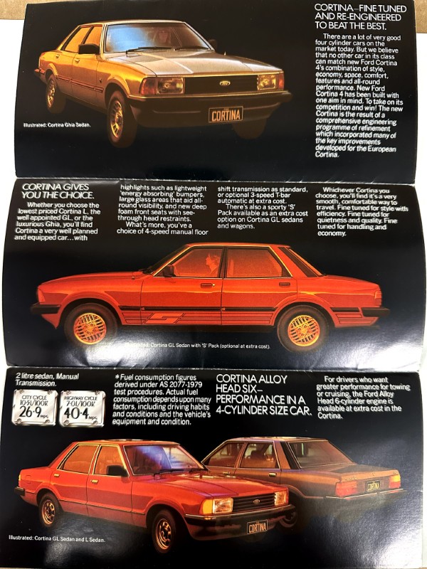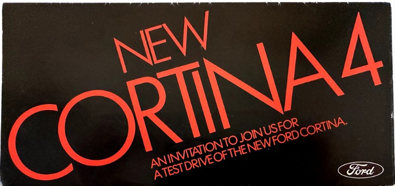 This is an original Ford sales literature piece. It features a promotional highlight for the Ford Cortina with colored photos.