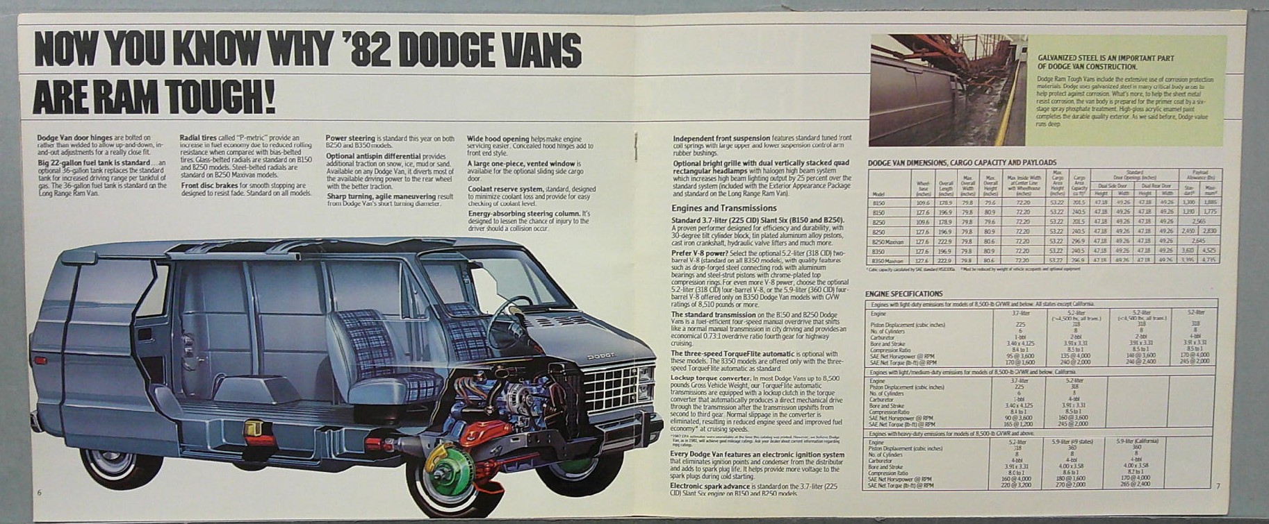 This is an original 1982 Dodge sales catalog. It highlights information on features and available options for Dodge’s Van lineup.