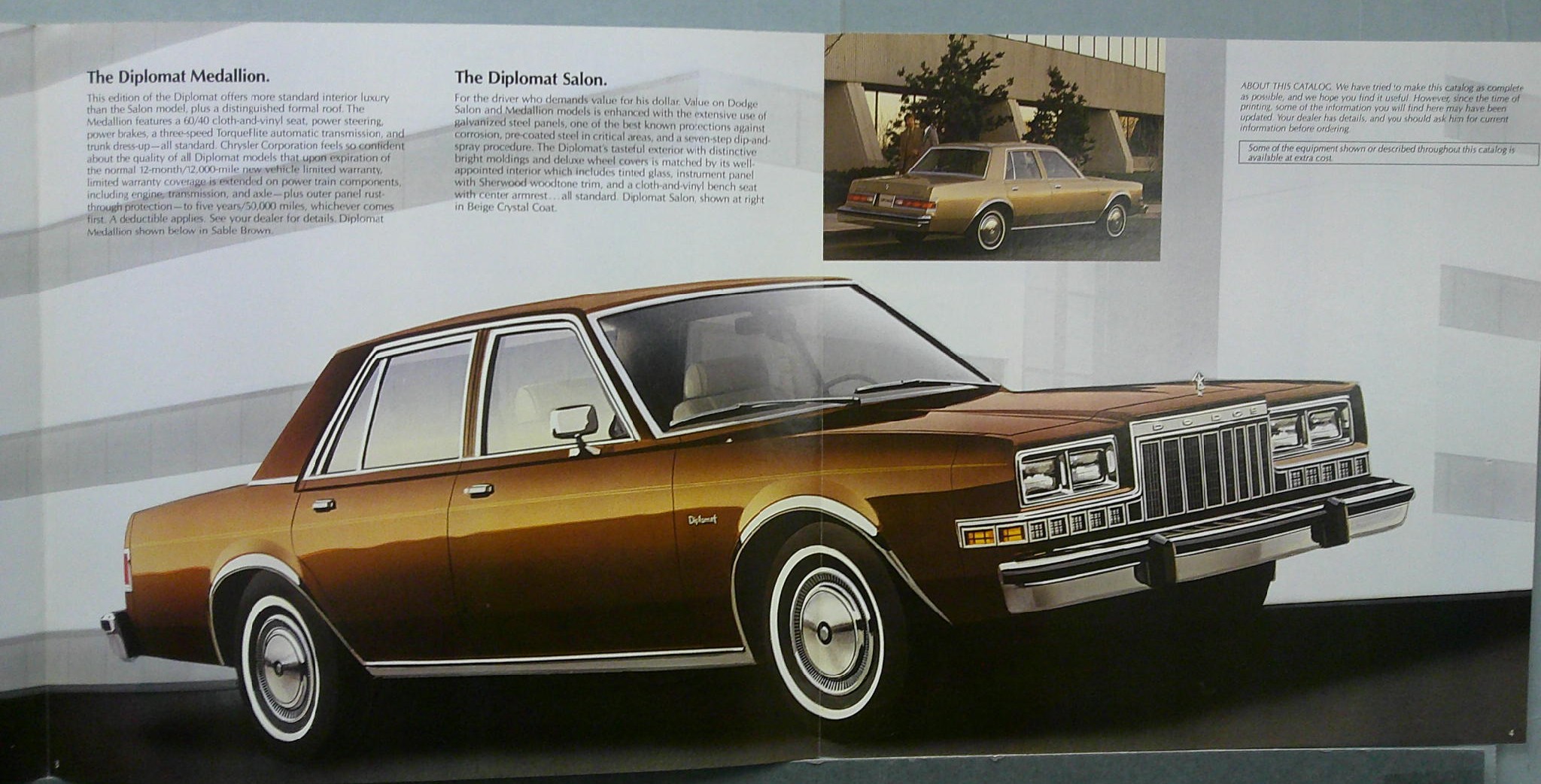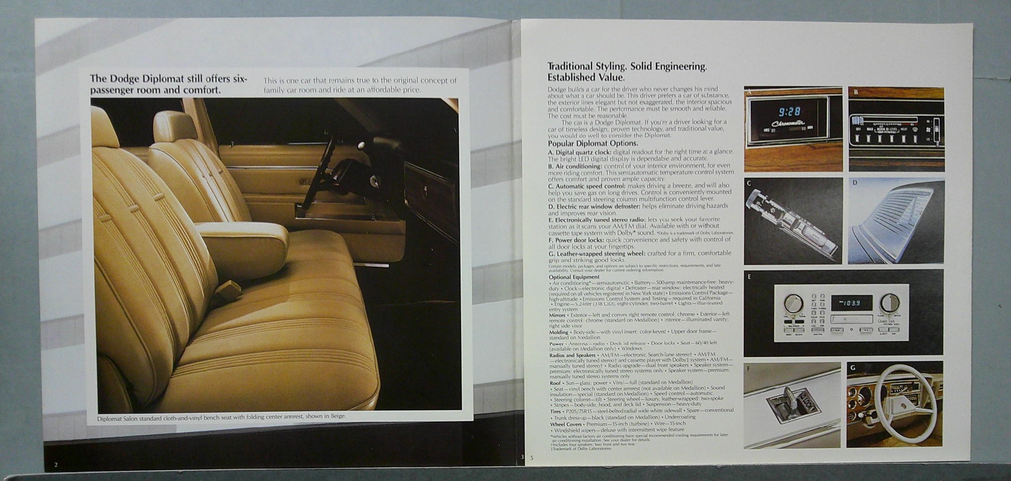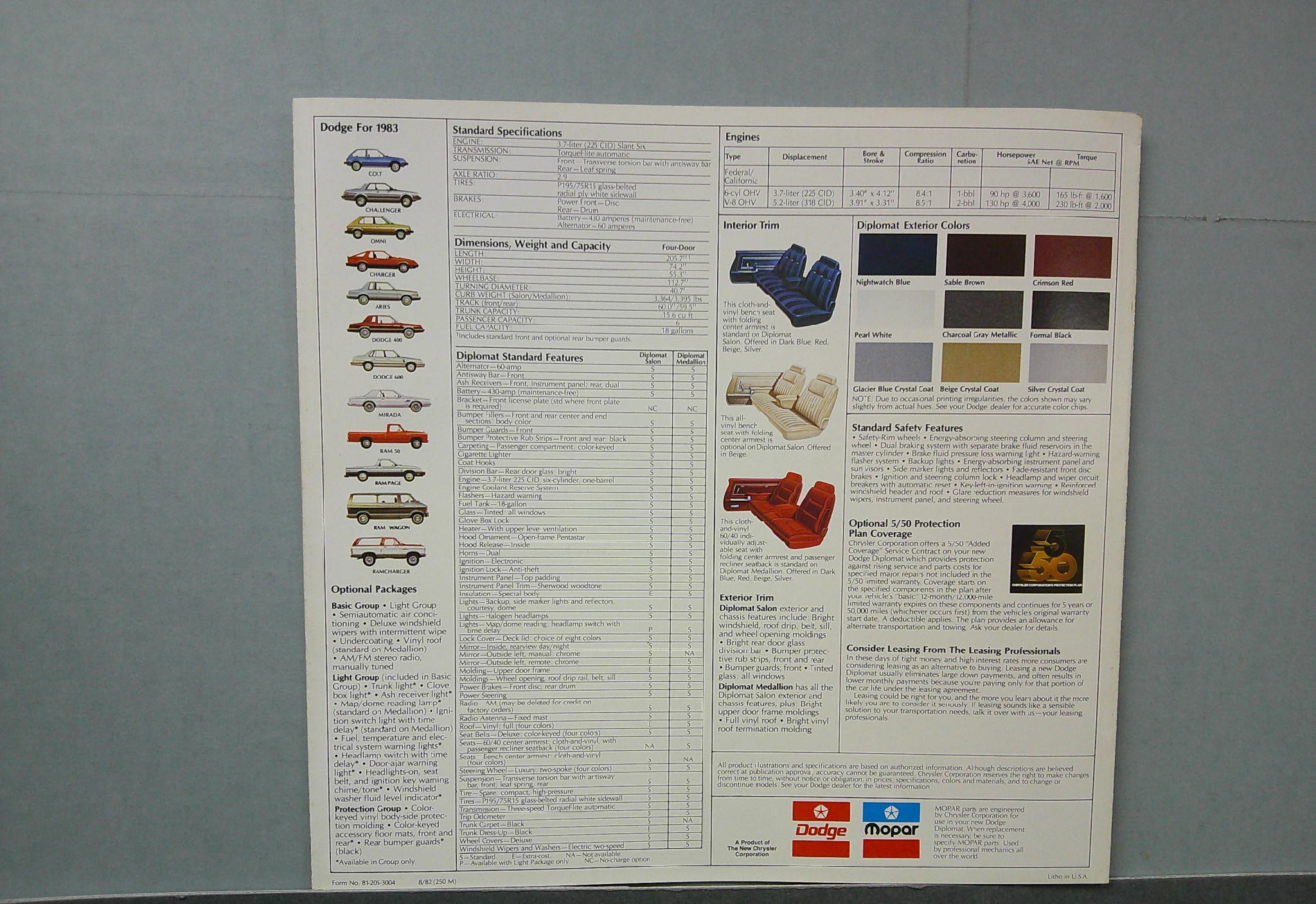 This is an original 1983 Dodge sales folder. It highlights information on features and available options for Dodge’s Diplomat lineup.