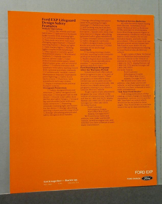 This is an original Ford sales catalog. It features promotional highlights for the Ford EXP with full color pictures and specifications.