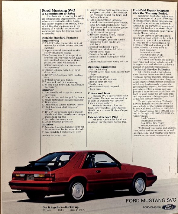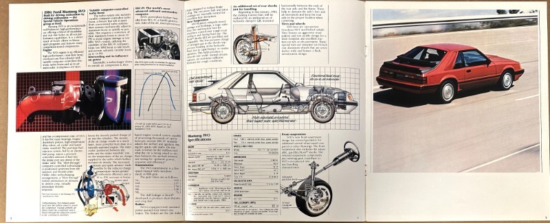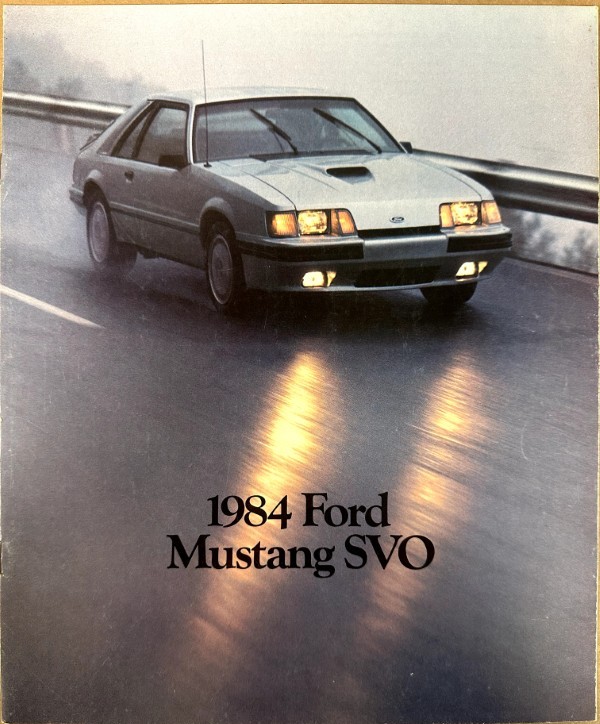 This is an original Ford sales literature piece. It features a promotional highlight for the Ford Mustang SVO with full colored photos.