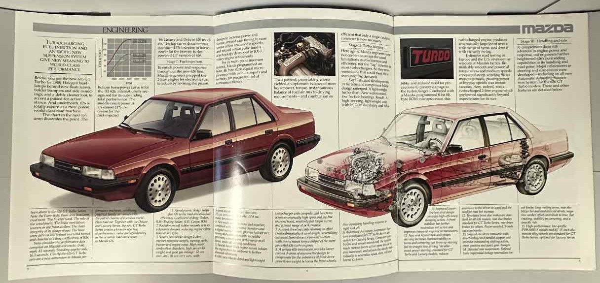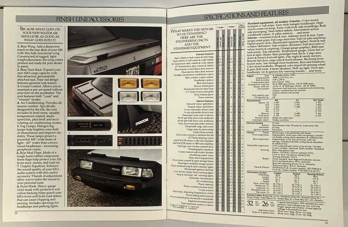 This is an original Mazda sales catalog. It features a promotional highlight for the Mazda 626 with full-color pictures and specifications.