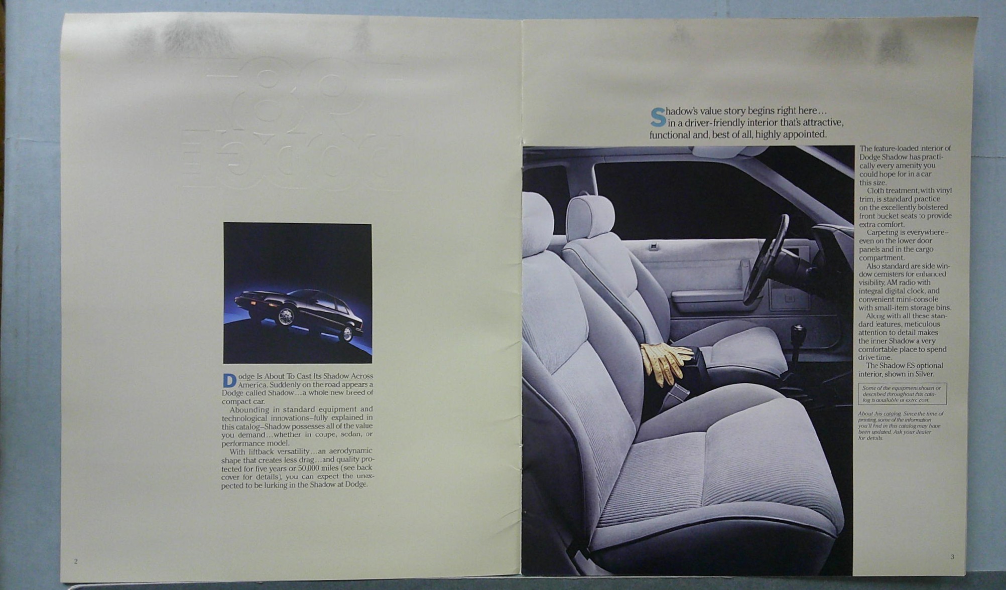 This is an original Dodge sales folder. It features promotional highlights for the Dodge Shadow with full color photographs and specifications.