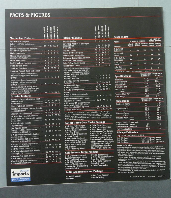 • Covers 1987 Plymouth Colt models including E, DL, and Premier
