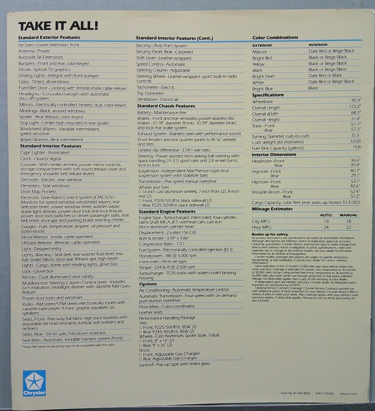 This is an original Dodge sales catalog. It features promotional highlights for the Dodge Conquest with full color pictures and specifications.