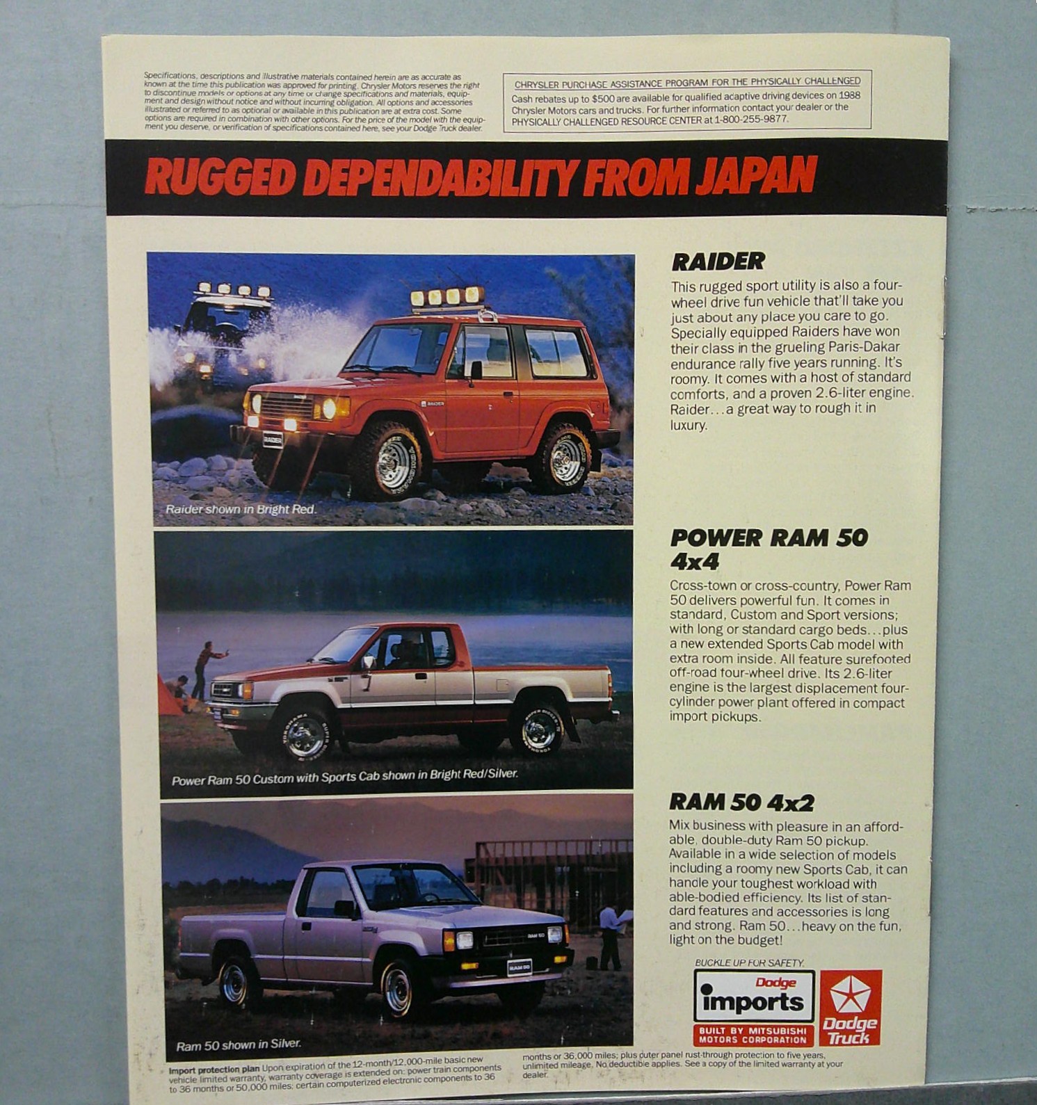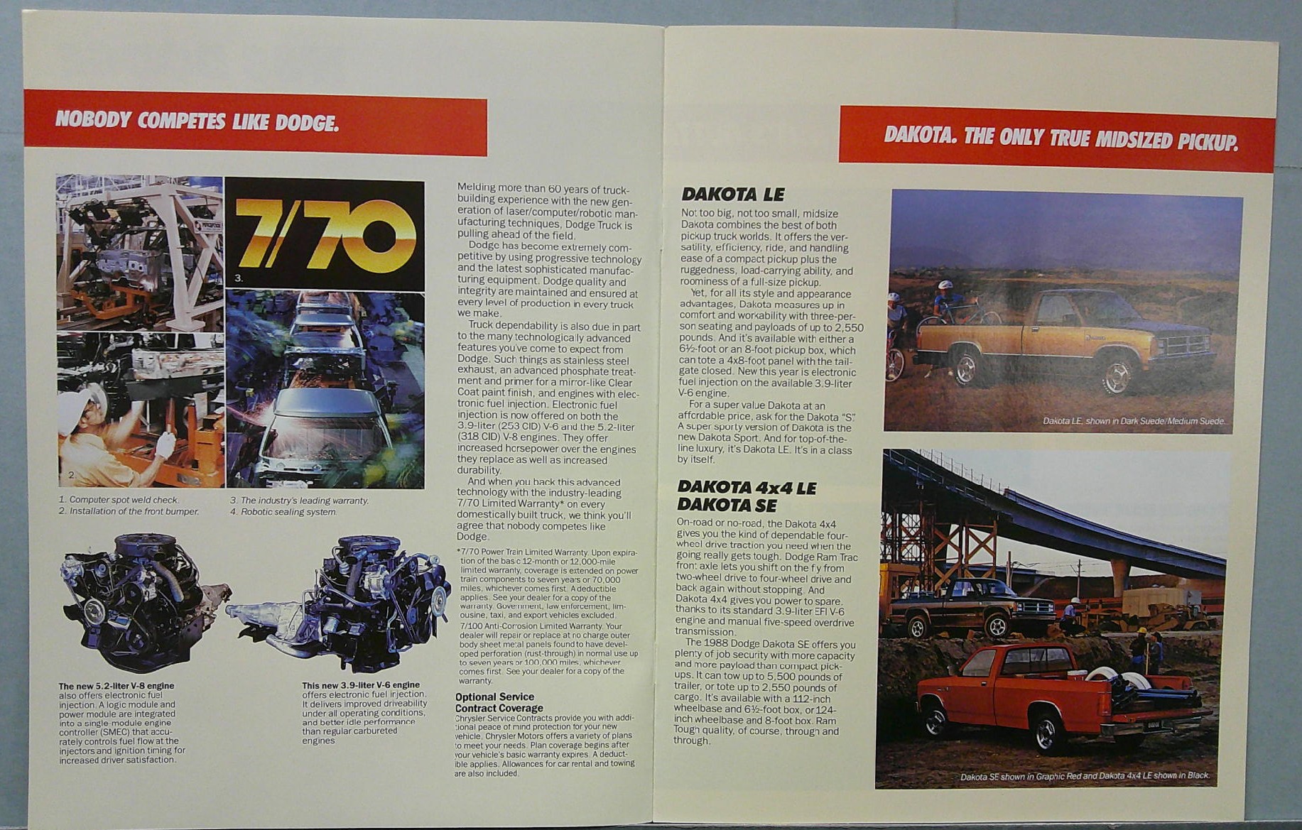 This is an original 1988 Dodge sales catalog. It highlights information on features and available options for Dodge’s truck lineup.