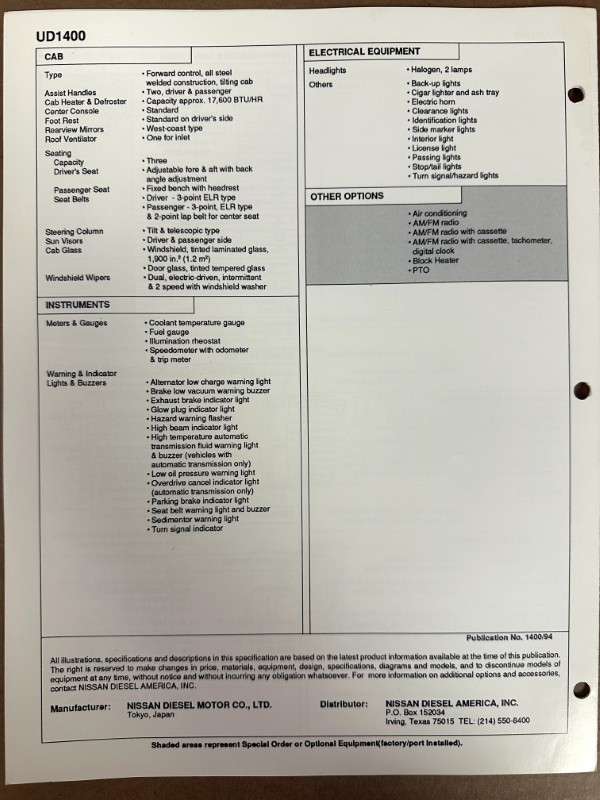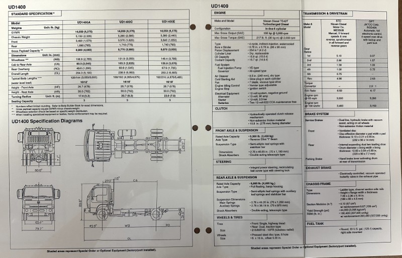 - Covers Nissan UD 1400 and 135 Turbo: specifications sheet