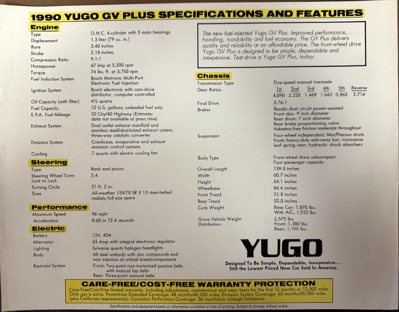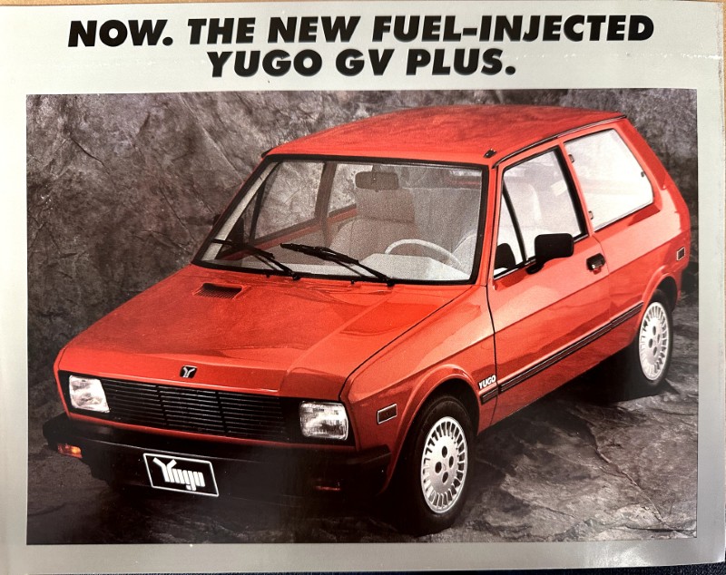 This is an original Yugo literature piece. It features a highlight on Yugo GV with gray photos.