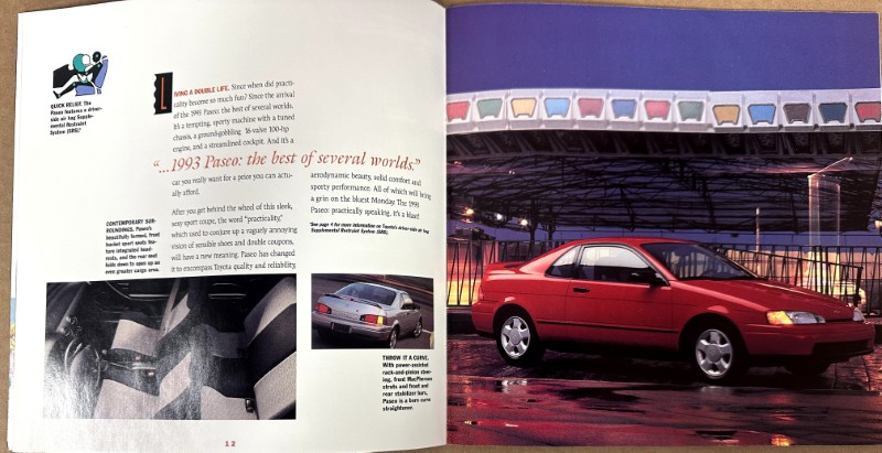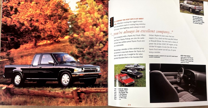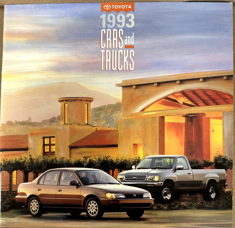 This is an original Toyota sales literature piece. It features a highlight on Toyota Cars and Trucks with colored photos.