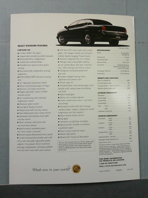 This is an original Chrysler sales folder. It features promotional highlights for the Chrysler LHS with full color pictures and features.