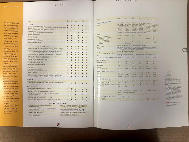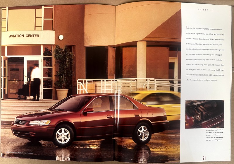 This is an original Toyota sales literature piece. It features a highlight on Toyota Camry with colored photos.