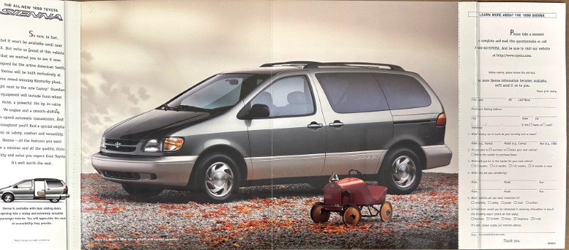 This is an original Toyota sales literature piece. It features a promotional highlight for the Toyota Sienna with full colored photos.