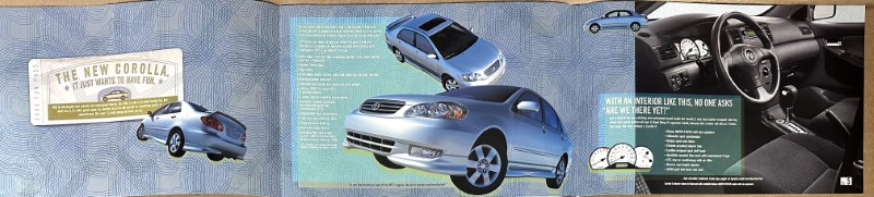 This is an original Toyota sales literature piece. It features a highlight on Toyota Corolla with colored photos.