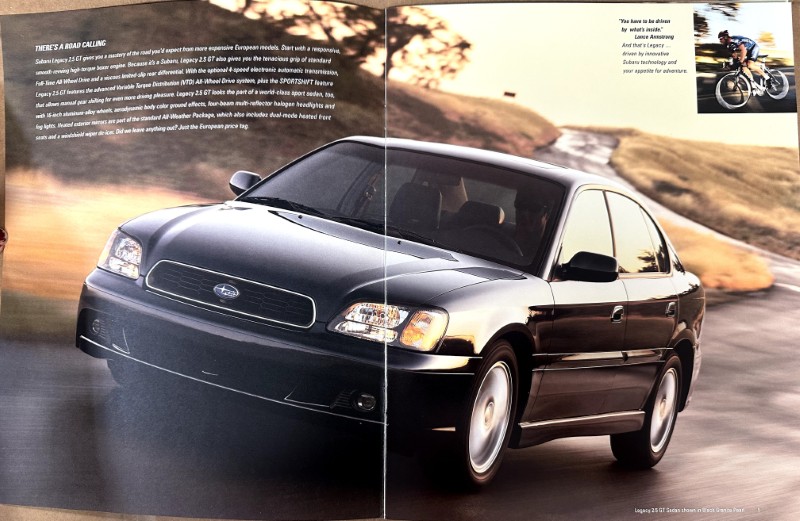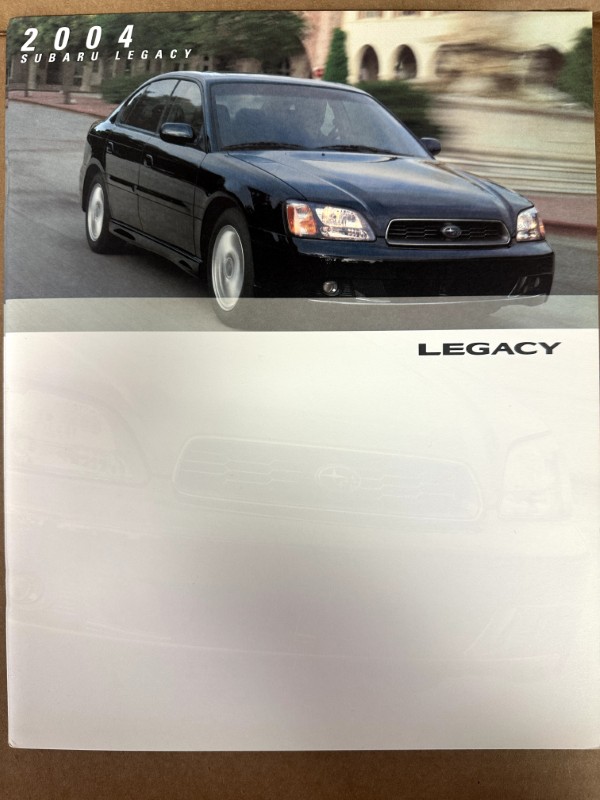 This is an original Subaru literature piece . It features a promotional highlight for Subaru Legacy with color photos.