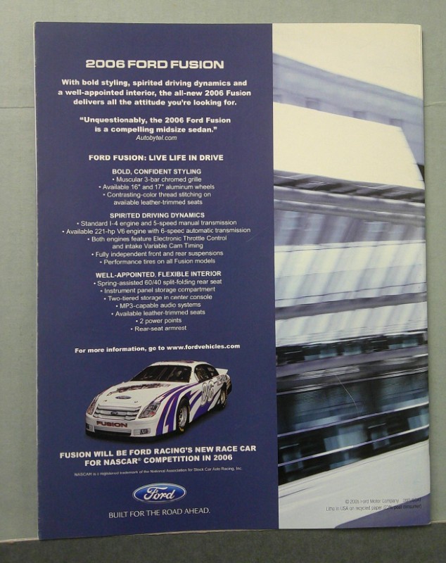 This is an original Ford sales catalog. It features promotional highlights for the Ford Fusion with full color pictures and specifications.