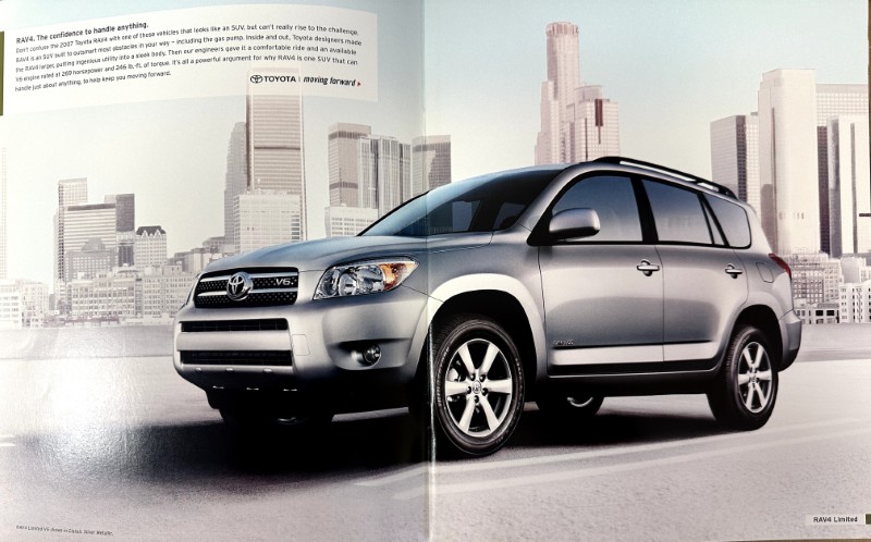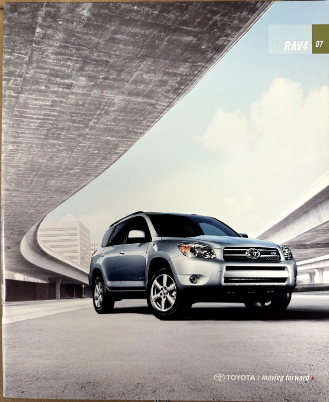 This is an original Toyota sales literature piece. It features a highlight on Toyota Rav4 with colored photos.