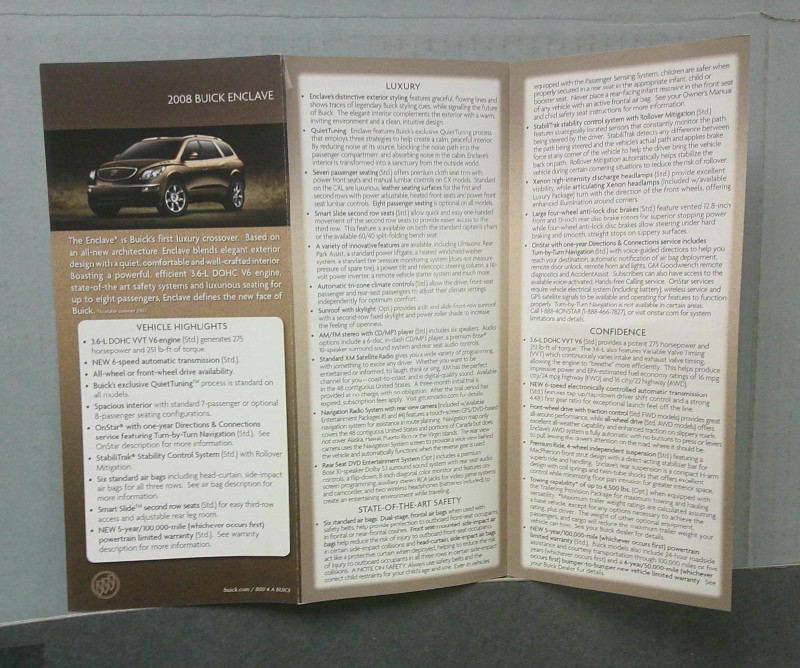 This is an original Buick sales folder. It features promotional highlights for the Buick Enclave with full color pictures and features.