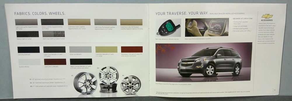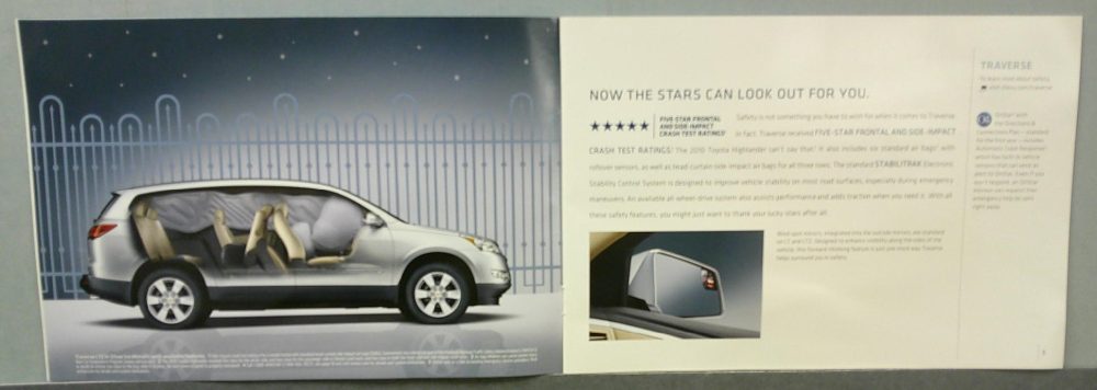 This is an original 2010 Chevrolet sales catalog. It highlights information on features and available options for Chevrolet’s Traverse model.