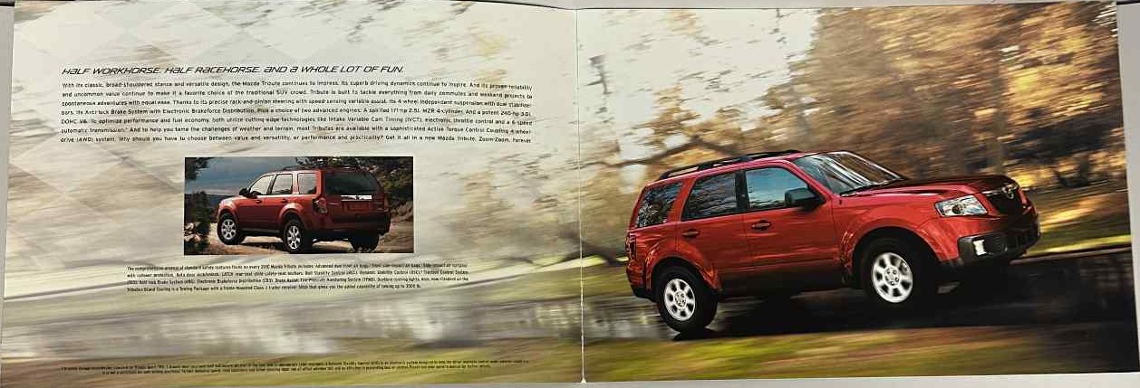 This is an original Mazda sales catalog. It features a promotional highlight for the Tribute SUV with full-color pictures and specifications.