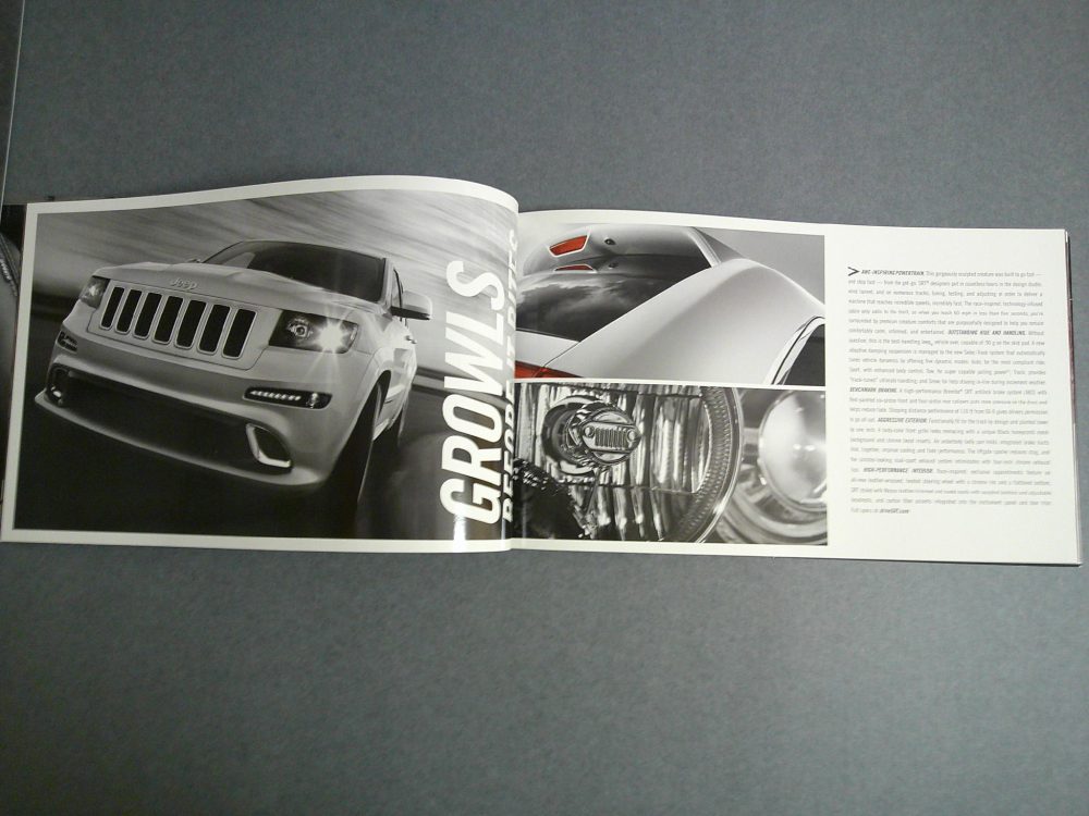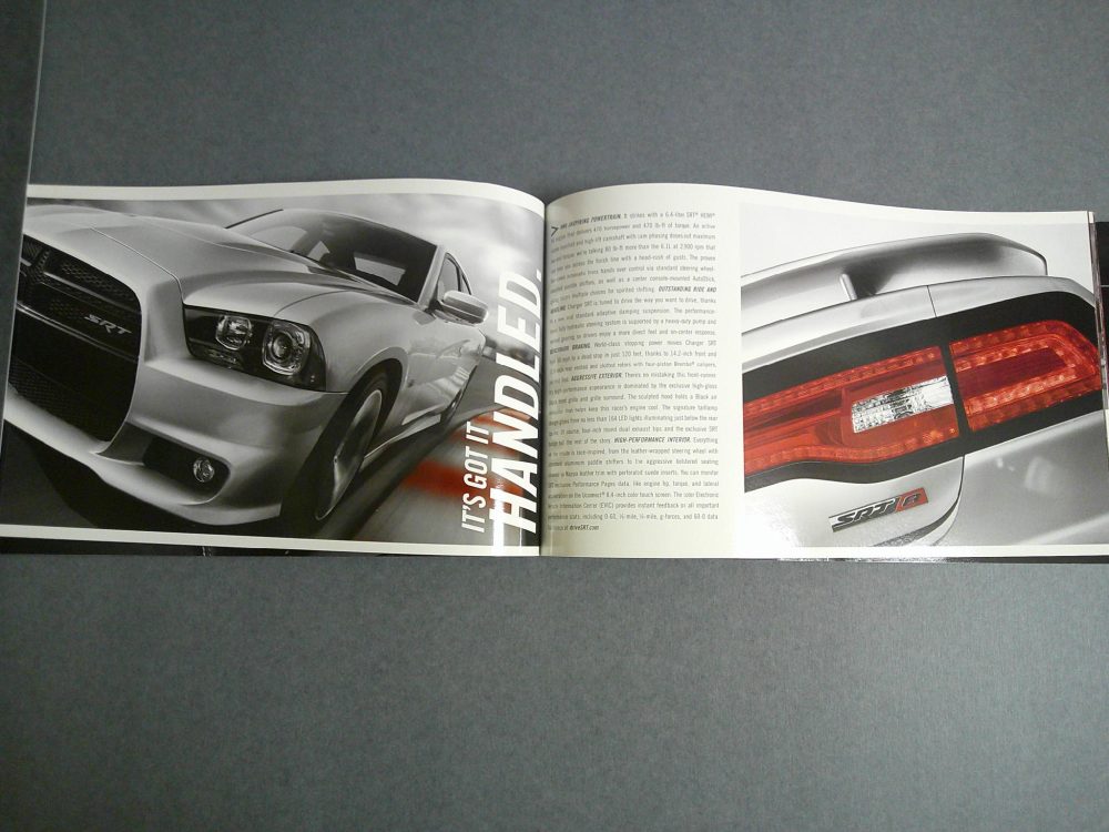 This is an original 2012 Chrysler sales catalog. It features detailed promotional highlights for Chrysler SRT vehicle lineup for the 2012 model year.