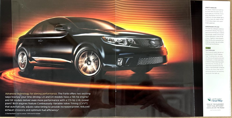 This is an original KIA sales literature piece. It features a promotional highlight for the KIA Forte with colored photos.