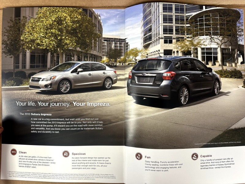This is an original Subaru literature piece. It features a promotional highlight on the Subaru Impreza, full color photos.