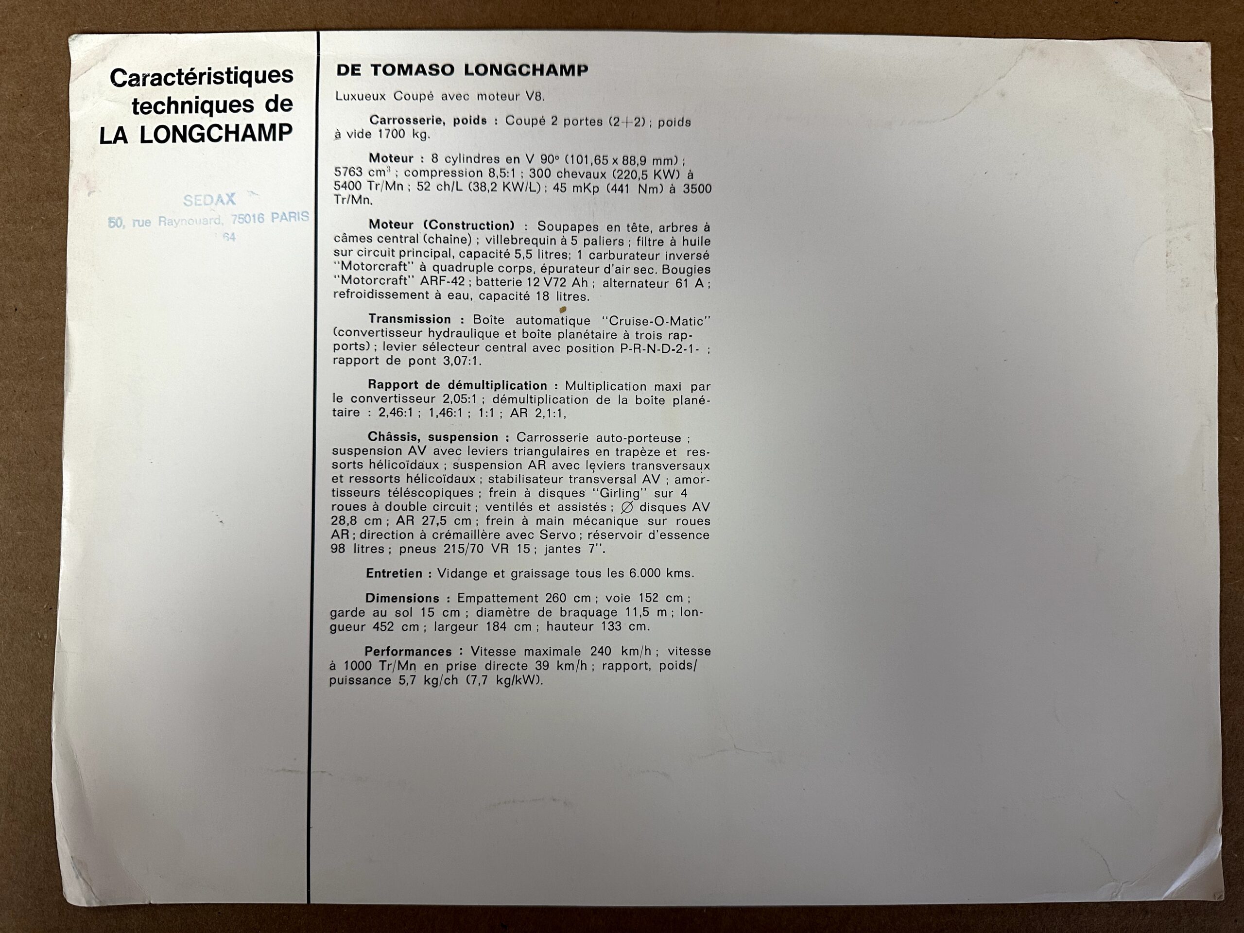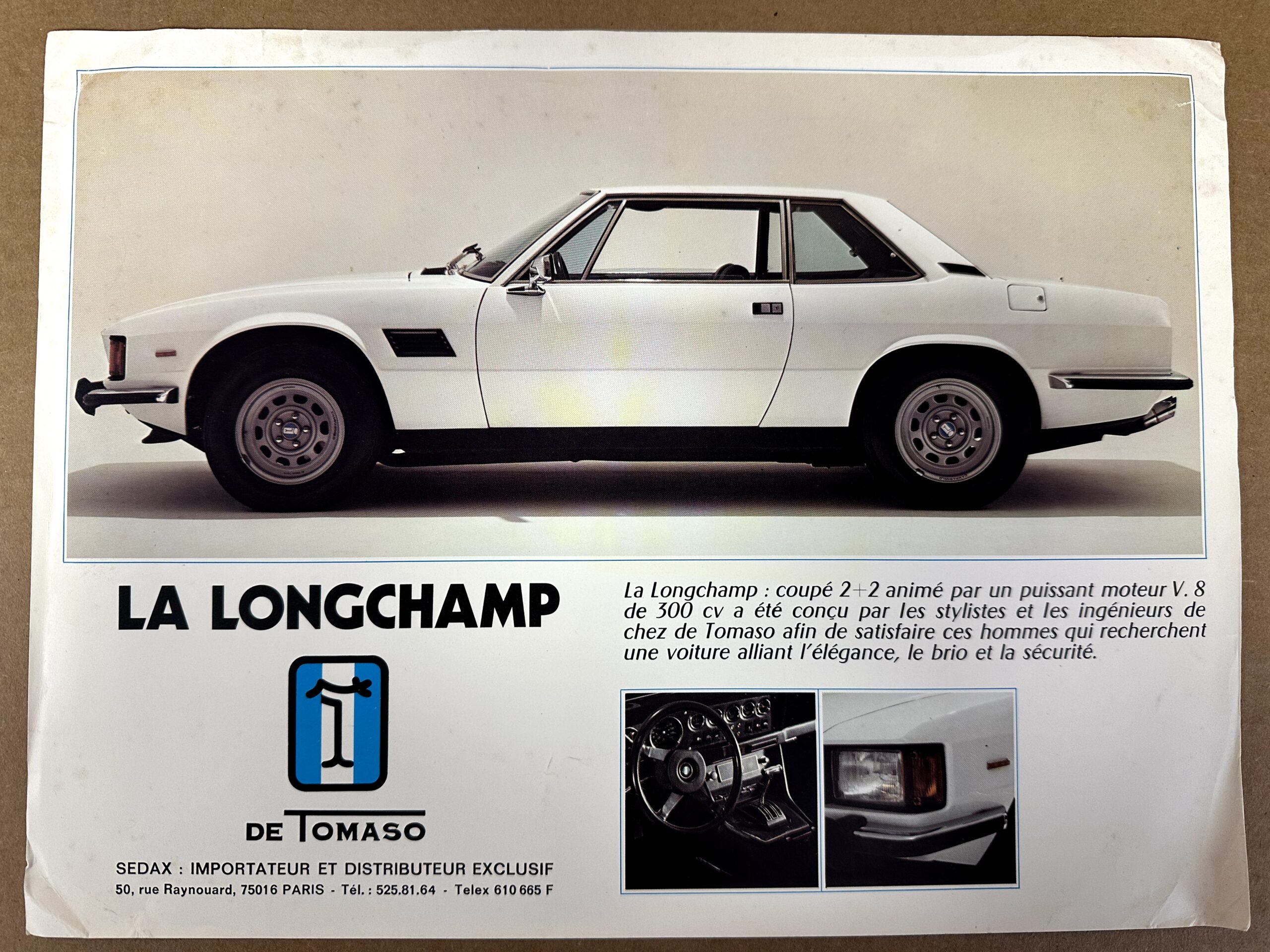 This is an original De Tomaso sales catalog. It features a promotional highlight on the De Tomaso La Longchamp, full color photos.